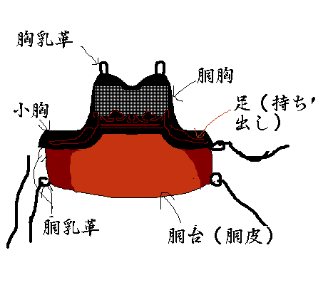 胸乳革・・・・・胴紐をここにむすびつけ、固定するためにあります。胴紐と胴を結んでいるのは