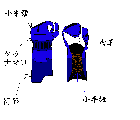 小手頭・・・・・・手の甲や指を保護します。材料は主に鹿革、牛革、クラリーノ、そして織刺