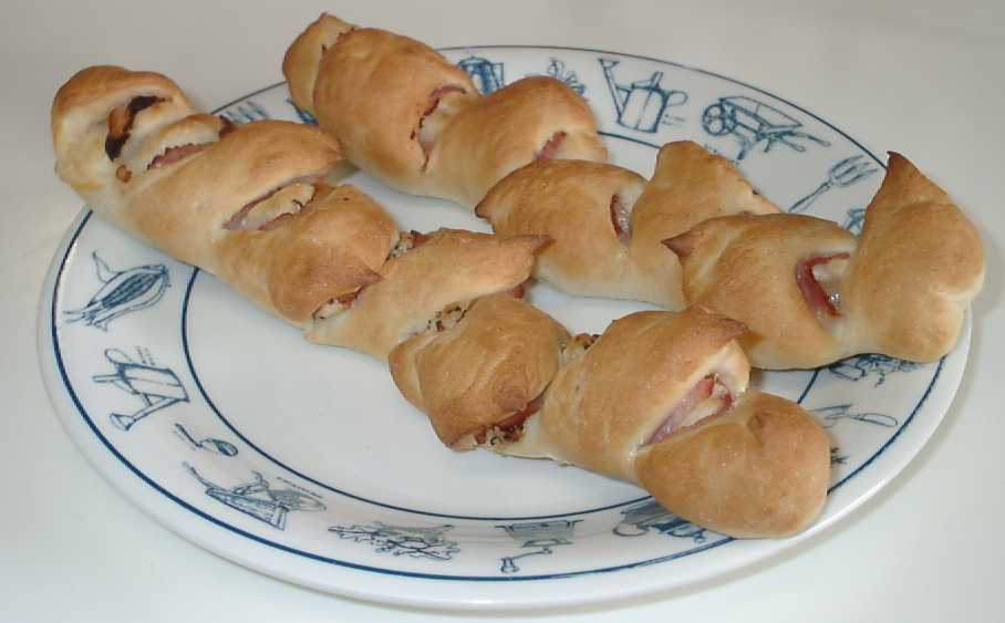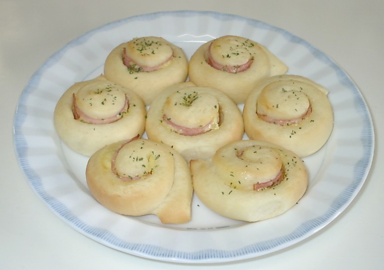 | 2003年1月13日 【メモ:オーブン熱風 予熱なし180℃15分】 2003年一回目のパン作りは、惣菜パン。理由はお昼の食事として・・(爆) 初回から失敗するわけにもいかずメニューには美味しく仕上がるロール系にしました。 中身は左が生地にマヨネーズを塗ってハムを巻いたハムマヨロール。焼き上がった後にはパセリをパラパラ。 右が生地に炒めた玉ねぎとベーコンを巻いてから切り口にマヨネーズを絞ったオニオンベーコンロール。こちらにもパセリをパラパラ。 う〜ん美味しかった♪(^-^) |