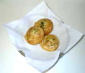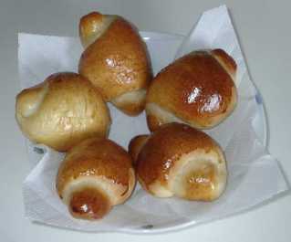 | 2002年9月1日 【メモ:オーブン熱風 予熱あり 180℃ 15分】 今日はロールパンの復習と新作に挑戦! ロールパンは、まあこんなもんじゃないっすかね。 新作のほうは、イメージしているものがレシピに見当たらなかったので少々アレンジを加えて・・・。 のばした生地にハムをはさみ、ぐるぐるとロールサンドに。 1センチくらいに切り分け、2次発酵後、マヨネーズとパセリをかけて焼き上げです。 うん美味しい! ロールパン 新作パン(うずまきハムロール?) |