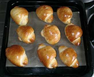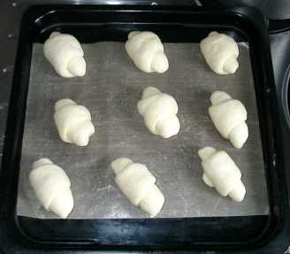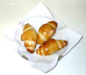 | 2002年8月25日 基本に戻ってロールパンを焼きました。 すると、改めて発見したことが・・・。うちのオーブンは発酵モードが少々高めに設定されているのでは 無いだろうか?ということです。 発酵ボタンを押すと40℃40分の設定になるのですが、どうも2次発酵時に発酵しすぎのような気がします。 今日のロールパンも発酵しすぎの気がします。 次回は発酵温度に工夫をしてトライです。 @成形 A2次発酵 B焼き上げ C完成 |