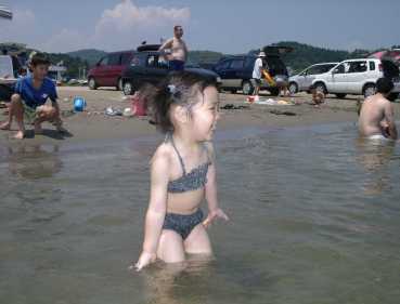 2001年7月15日 初めての海水浴。最初は波が怖かったけど少し慣れてきたみたい。 |