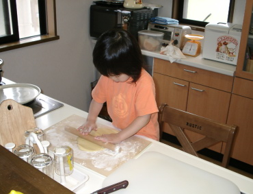 2002年6月30日 おいしいパンをつくろう♪真剣に生地を伸ばしています。 |