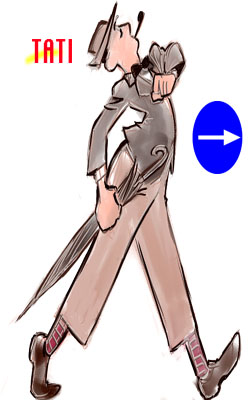 DVDがでたら即買いしようと思っている映画があるが、 その監督がジャック タチだ! パントマイム芸の芸人で、その映画は トリュフォーやゴダールにも影響を与えたという。 彼の映画は一応コメディーということになるのだが、 主人公のタチ自身、ほとんどセリフがない。と いうより、セリフをしゃべらないためにわざと、 つねにパイプをくわえたキャラクターを演じている。 これはチャップリンやキートンのような動きでみせる 無声映画の世界を、トーキー(音付き映画)の時代に 再現したものか、といえば、そうでもないのだ。 彼の映画は、人々が日常のなかで出会うヘンな出来事、 おかしな出来事を、多少誇張して再現したものなのだ。 今でいうなら、さんまのからくりテレビのハプニング ビデオ集などに近い感じ。タチはこれを「喜劇の民主化」 とよんでいたという。萩本欽ちゃんなども舞台 ではチャップリンに近いが、テレビでは明らかに タチ寄りである。 今ではテレビという媒体でやっている、簡単に 流れて行き何も残らないようなものを映画にして おもしろいのか、というかもしれないけど、 そこは映画だ。タチの類い稀なるセンスが あふれている。デザイン、カラーの素晴らしさ。 そしてお祭りや夏、ひとつの行事が終わる時に 感じるあの淋しい気分。これらが、ともすれば ストーリー性など無いに等しい、コマ切れになりそうな シークエンスの連続に整合性を与えている。 あと右の絵を描いてて思ったけど、でかい図体に つんつるてんの短い服装。帽子をかぶり、晴れてるときも 常に傘を持つ。これってチャップリンの服装と似てる。 もっともチャップリンはつんつるてんの上着に ダボダボズボンに杖だけど。やはりタチの頭には、 画だけで見せるサイレント映画の復興があったのかも しれない。 |