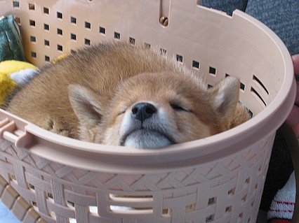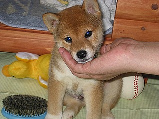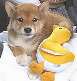 『我が家にやってきた日』 2004.7.3 富山市の生家から我が家にやってきた日。 始めてのドライブ。 1時間も車にゆられて車酔い。 急に親元から離されるとさびしくなるかと思い、写真のアヒルちゃんに母犬のにおいをつけてきた。 「お母さん、小さくなっちゃったなあ」 とか思ってるんだろうか。 |