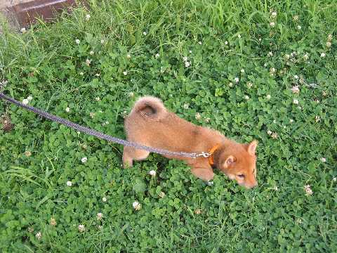 で、シャワーできれいになったのもつかの間、コロタは草むらにかけこんで行く。やめて。 夏だから特にヒンヤリした場所が好きなのだろうけど、基本的に草むらが好き、というのはあるみたいだ。安心するのか、オシッコやウンコもよくここでする。この写真はオシッコをしているところ。なんだか悲しいような顔をしてこっちを見るのだ。 |