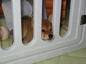 最終的には外に犬小屋をおいて飼うつもりだけど、まだコロタは小さくて弱い。柔らかさも1コロタである。しばらくは室内で生活することになった。玄関のわきの部屋に犬小屋を置いて。柵でかこって。 おい、なんだそのポーズは。 |