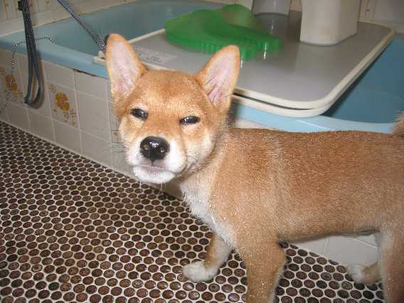 風呂場で変な顔。 耳が大きく見えるのは、毛が抜けて耳以外の場所が細くなっているから。 |