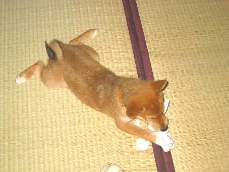 ひとしきりかじりついた後、顔をつっこんで寝そべるコロタ。 この姿勢のまま、なぜかときどき「ピタッ」と動きが止まるのがおもしろい。 |