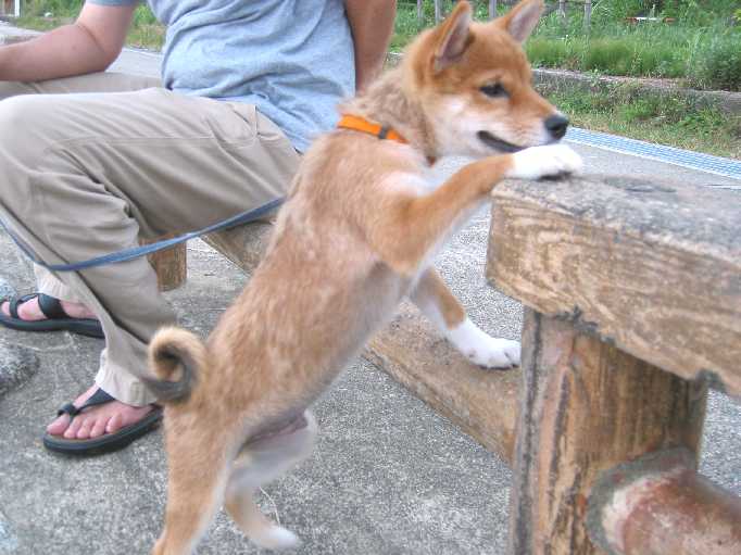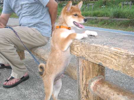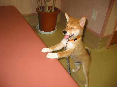 ななめ。いや、なんでか知らんけど。 犬は基本的に高いところが苦手らしいので、ちょっと怯えているのかもしれない。 首ヒモがピーンと張っている。首が痛くならないかと思うけども。 |